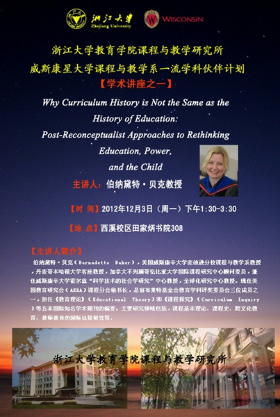 伯纳黛特•贝克(Bernadette Baker),美国威斯康辛大学麦迪逊分校课程与教学系教授,丹麦哥本哈根大学客座教授,加拿大不列颠哥伦比亚大学国际课程研究中心顾问委员,兼任威斯康辛大学霍尔兹“科学技术的社会学研究”中心教授,全球化研究中心教授。现任美国教育研究会(AERA)课程分会秘书长,是富布莱特基金会教育学科评奖委员会三位成员之一,担任《教育理论》(Educational Theory)和《课程探究》(Curriculum Inquiry)等五本国际知名学术期刊的编委。主要研究领域包括,课程基本理论、课程史、跨文化教育、教师教育的国际比较研究等。
