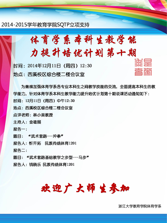 为继续加强体育学系各专业本科生之间教学技能的交流,全面提高本科生的教学能力,针对体育学系本科生教学能力提升培优计划第十期说课活动通知如下: