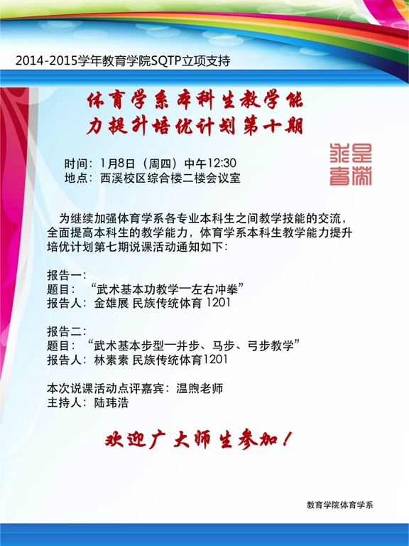为继续加强体育学系各专业本科生之间教学技能的交流,全面提高本科生的教学能力,体育学系本科生教学能力提升培优计划第七期说课活动通知如下: