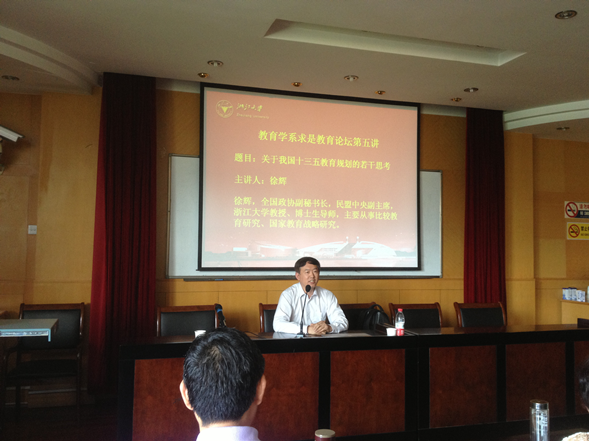 2015年6月5日下午,西溪田家炳书院520室beat365官方网站学术报告厅座无虚席。全国政协副秘书长、民盟中央副主席,浙江大学教授、博士生导师徐辉应教育学系之邀,主讲“求是教育论坛”第五讲——“关于我国十三五教育规划的若干思考”,吸引众多院内外师生。
