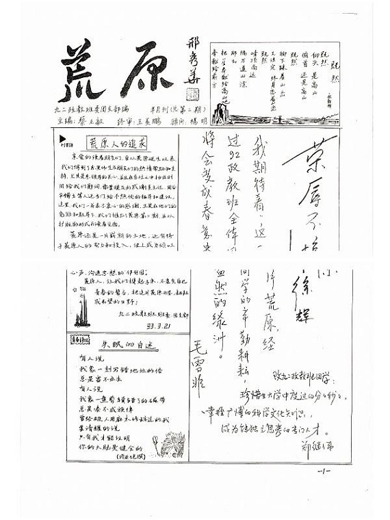 同学会上,大家一起观看了由蔡正敏校友制作、主讲的视频“班级历史回顾与同学会发展”,上篇为“我们的大学时代”,下篇为“我们的同学会”。其中提到了班刊《荒原》,是当时原杭州大学19份公开发行的学生报刊之一,当时教育系多位老师为创刊题字,毛雪非老师题字“我期待着,这一片荒原,经过92政教班全体同学的辛勤耕耘,将会变成春意盎然的绿洲”,徐辉老师题字 “荣辱不惊”,郑继伟老师题字“致九二政教班同学:珍惜在大学中度过的分分秒秒,掌握广博的科学文化知识,成为能独立思考的专门人才”。
