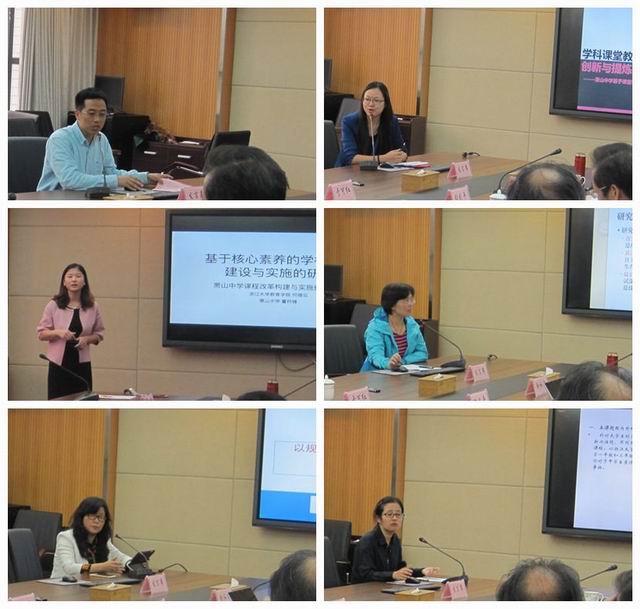 学院项目组负责人孙元涛、刘徽、何珊云、李艳、徐琴美、叶映华等老师分别就“办学经验和发展理念的研究与创新”、“学科课堂教学范式的创新与提炼——基于课堂学习研究的设计教学方案”、“基于核心素养的学校课程建设与实施的研究”、“萧山中学智慧课堂的开发与研究”、“以规划谋发展以学习修内涵以活动创品质——萧山中学教师专业发展培育工作的实践研究”、“学生成长与生涯规划指导的研究”等六个研究课题向评审专家进行了现场汇报,着重从项目背景、研究目标与研究内容、研究进程、预期成果等方面论述了课题研究计划。论证专家认真听取了项目负责人的汇报,对各项目组的选题和准备工作予以了充分的肯定,并从研究工具与方法、研究目标指向、研究结果如何有效指导教学实践、新的挑战和机遇下如何做好传承与创新等方面提出了具体并有针对性的修改意见和建议。