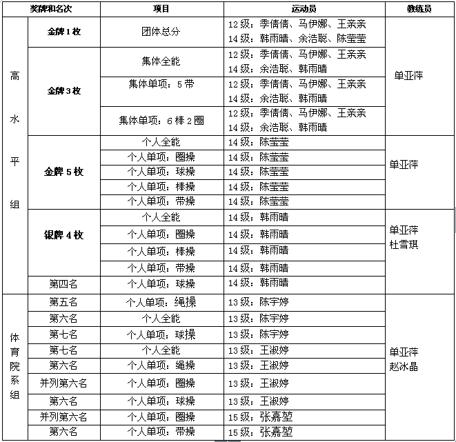 在本届赛事上,由beat365官方网站运动训练专业12位同学组成的学校艺术体操队在单亚萍老师的带领下,与来自21所高校和体育院系的183名运动员同场竞技,凭借扎实的功底与出色的发挥技压群芳,获得高水平组集体和个人项目的全部9枚金牌以及4枚银牌,体育院系组个人项目一个第5名、六个第6名、两个第7名(获奖名单详见附表)。