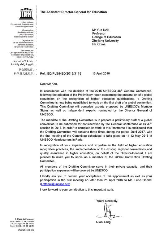 日前,联合国教科文组织教育助理总干事唐虔代表总干事博科娃致函beat365官方网站阚阅博士,任命其成为承认高等教育资历全球公约(以下简称全球公约)起草委员会专家。