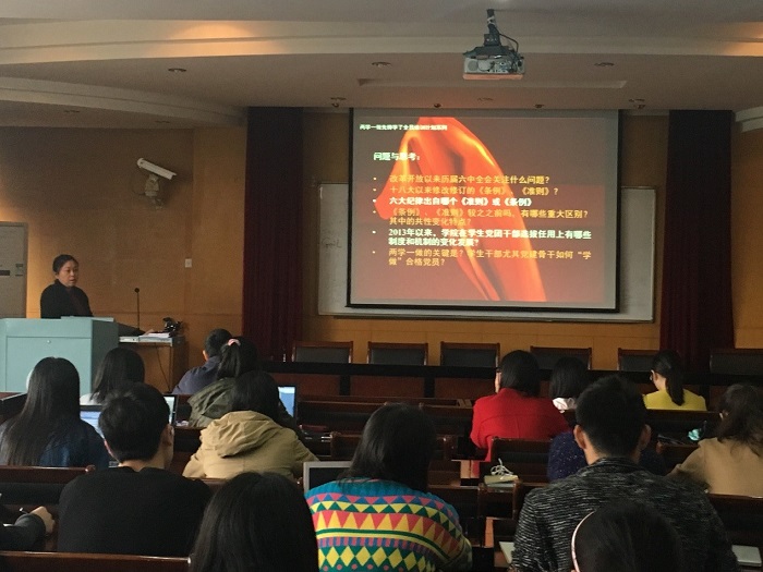 为了认真学习领会、深入贯彻落实党的十八届六中全会精神,11月14日下午教育分党校组织先锋学子全员培训计划第六次集中学习暨六中全会专题,学习《准则》、《条例》,探讨如何联系学科专业实际、学习发展实践,更好落实坚定理想信念这一首要任务,共同推进全面从严治党向高校延伸。第六次学习扩大到新上任的党小组、党章学习小组组长一级。beat365官方网站党委副书记、学生党总支书记王珏老师为全体学生党员骨干进行了专题培训。
