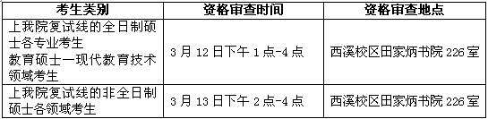 考生必须通过学院统一进行的资格审查(详见下表安排),并请按附件三《beat365官方网站关于2017年硕士研究生报考资格审查的通知》、附件五《beat365官方网站2017年硕士研究生报考资格审查材料清单》规定的要求准备好各项材料。本校应届考生参加复试无需资格审查。