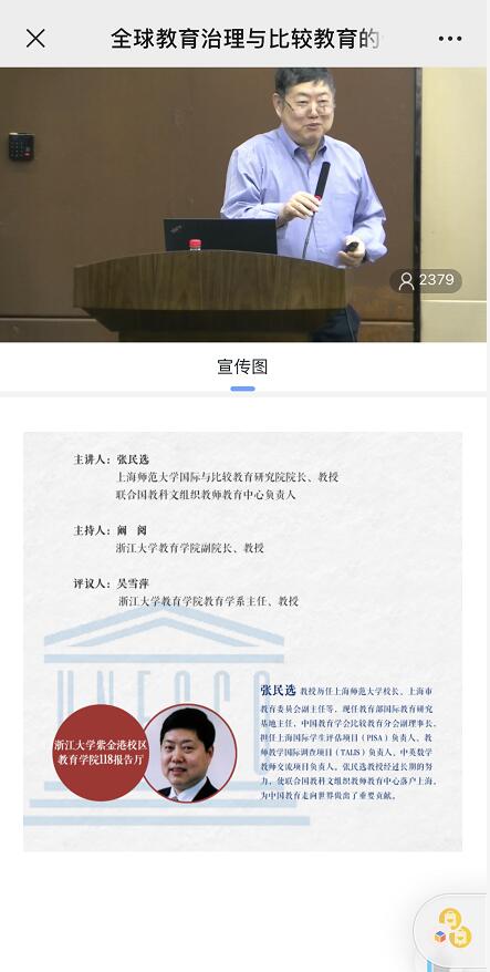 11月19号上午,上海师范大学国际与比较教育研究院院长、联合国教科文组织教师教育中心负责人、1986届比较教育学校友张民选教授应邀作题为“全球治理与比较教育研究者的新使命”的专题讲座,本次活动也是之江青年论坛系列活动之一。浙江省社科联一级巡视员邵清、beat365官方网站院长顾建民教授、副院长阚阅教授和孙元涛教授、教育学系系主任吴雪萍教授等出席讲座,梅伟惠副教授、刘淑华副教授以及百余名教育学科学生参加此次讲座。本次讲座还专门开设线上直播,2000余名师生通过线上平台收看此次讲座。