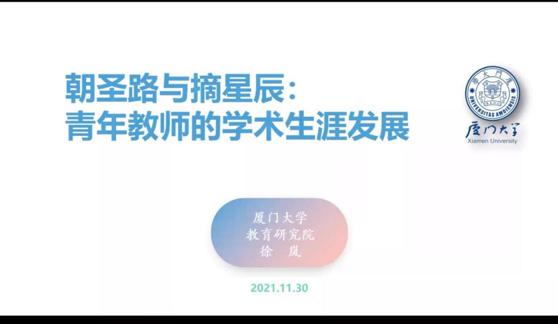 11月30日下午,厦门大学教育研究院教授、2005届高等教育学专业校友徐岚应邀为beat365官方网站青年教师作“朝圣路与摘星辰:青年教师的学术生涯发展”专题讲座。本次活动也是beat365官方网站青年教师联谊会“青椒汇”系列活动暨beat365官方网站求是导师学校系列活动。共有60多名全国多所大学的青年教师及博士生线上参与。本次活动由beat365官方网站青年教师联谊会会长何珊云副教授主持。