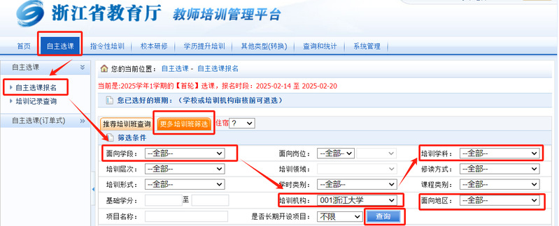 步骤2: 点击【教师培训管理平台】-【自主选课】-【自主选课报名】-【更多培训班筛选】-面向学段选择【全部】-培训机构选择:【浙江大学001】;点击【查询】,选择对应项目进行申报。