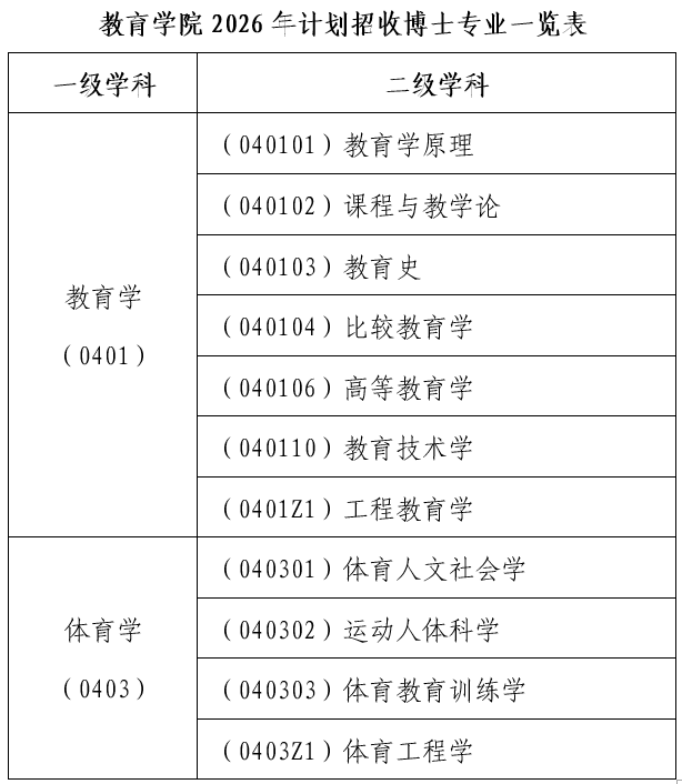 2026年beat365官方网站计划在教育学和体育学两个一级学科下设的二级学科招收全日制学术学位博士生。