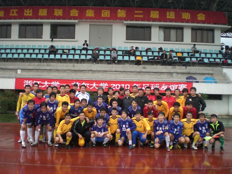 The football team of Seoul National University, which was led by the department head, Professor Cheulsoo Chung, had visited the Department of Physical Education in the College of Education in Zhejiang University during Oct 22nd to Oct 26th, 2010. Two friendly matches between the football teams of Seoul National University and Zhejiang University were held in the Yuquan and Xixi campuses. Typhoon Catfish, as well as the strong cold air, had struck Hangzhou during the visit. However, the players of the two teams, regardless of the bad weather, played well and made joint effort in the two games. Spectators around the playground all enjoyed the matches because of the fabulous performance of the two teams, as well as their spirit in team work, and mutual trust. The football team of Zhejiang University has won the competition by 3:3 and 3:2.