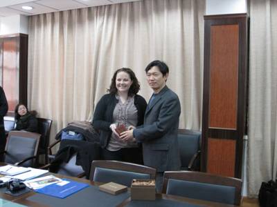 Deputy Dean Professor Xu Xiaozhou warmly welcomed her and presented an overview of our college talking about areas such as history, mission, courses, fostering talent, international communication and cooperation, and others. Soon after, both sides discussed the exchange of student and faculty and academic visitations. According to our university summer vacation foreign affairs meetings and the UIUC “3+2” agreement project, both colleges accomplished the first steps in cooperation concerning the mutual exchange of faculty and students, the establishment of English curriculum, and implementation of the “3+2” degree project.